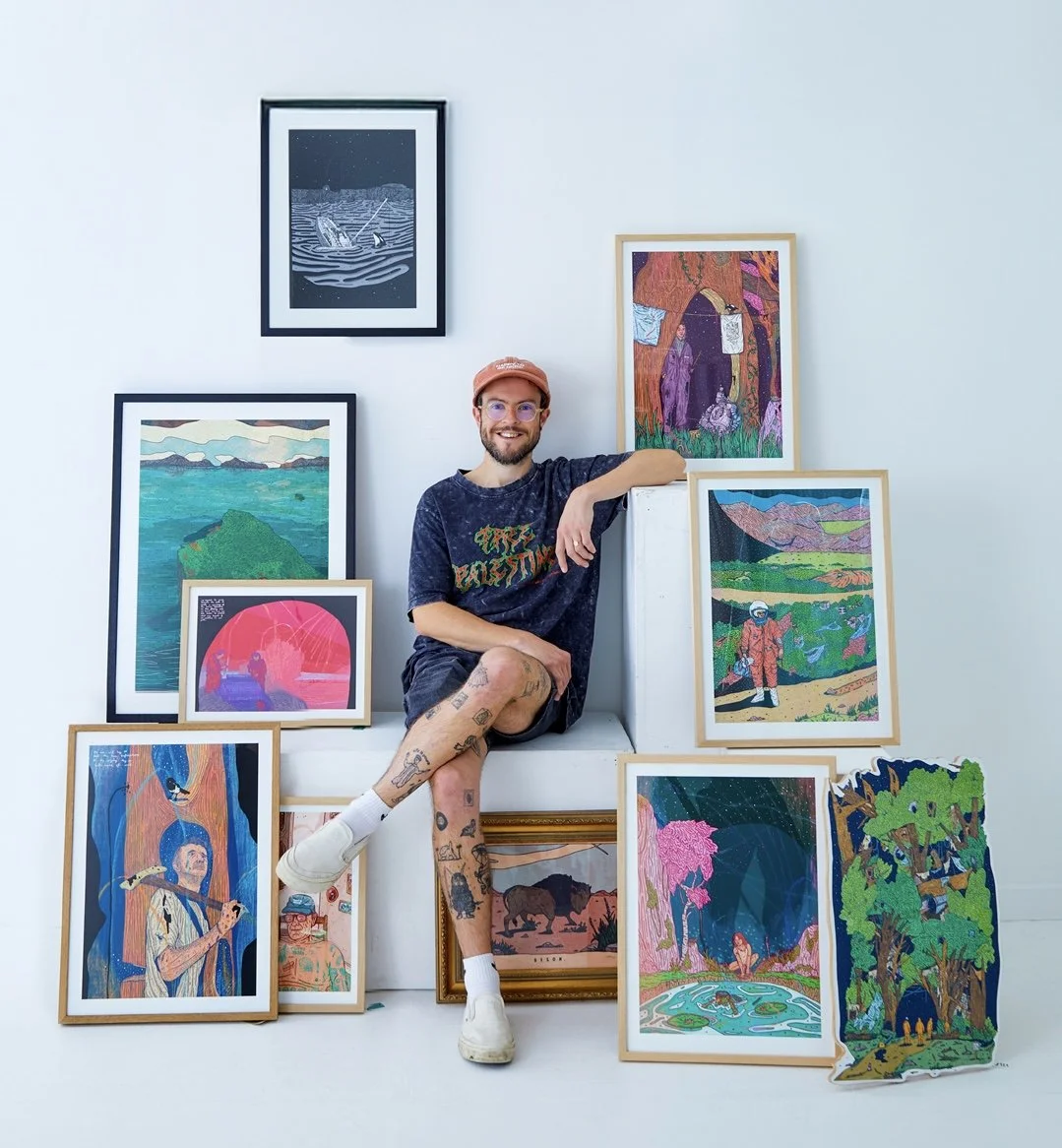 Focussing on drawing and primarily working digitally, his aim is to create a physicality in digital drawing, and a digital cleanness in physical work. He combines detailed illustrations, abstract mark making and texture to bring narratives, wording and ideas into his recognisable style.