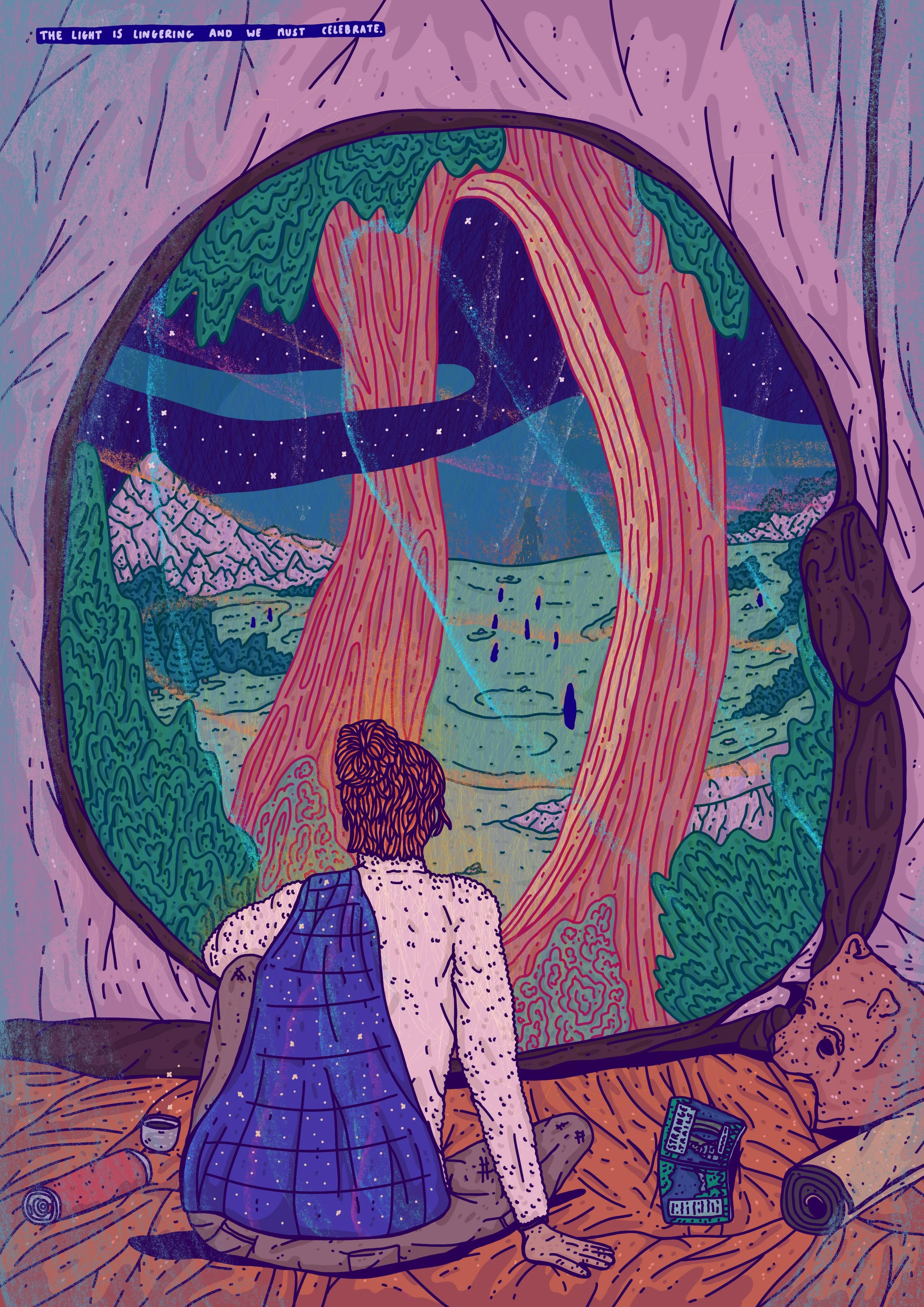 The camper waits, watching the people move towards the horizon, a glow throbbing in the distance. The faint outline of the figure feels hopeful, but she will only know for sure on its arrival. She contemplates staying in her tent, as the thought of a definitive answer brings uncertainty and feels like the first step towards disappointment.